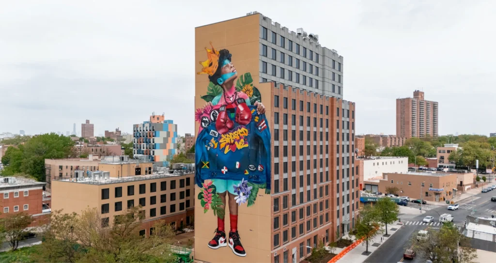 Artist Victor “Marka27” Quiñonez has created what’s being called Brooklyn’s largest mural, a stunning 150-foot artwork titled “Brownsville King of Love” at 326 Rockaway Avenue. Produced in partnership with ArtBridge, the piece transforms an underutilized building facade into a powerful celebration of Brownsville’s rich cultural legacy. The mural depicts a local youth wearing a golden crown and holding a custom jean jacket bearing the message “Spread Love,” adorned with patches honoring the neighborhood’s hip-hop heritage (M.O.P., Duck Down Records) and Caribbean roots. Boxing gloves inscribed with “Brownsville” pay tribute to the area’s legendary fighters, including Mike Tyson, Shannon Briggs, and Riddick Bowe. Created over weeks from a crane that appeared tiny against the massive scale, the artwork has become a community landmark that embodies ArtBridge’s mission of empowering artists to activate overlooked public spaces with meaningful, large-scale art.