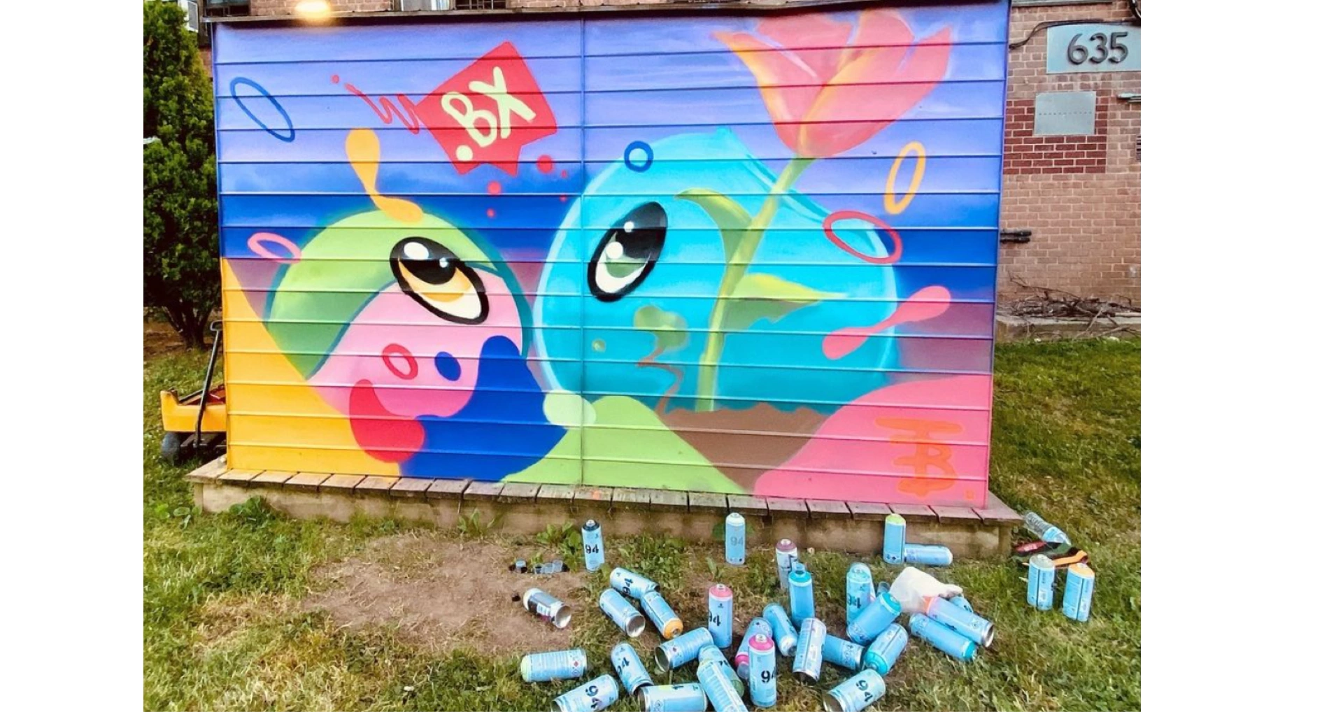 Inspired by the natural landscape, the mural features a combination of The Bronxer’s iconic graphic figures along with images of trees and flowers. This mural was made in partnership with Grow NYC, Resident Association President Ms. Salcedo, and the office of Council Member Farias.