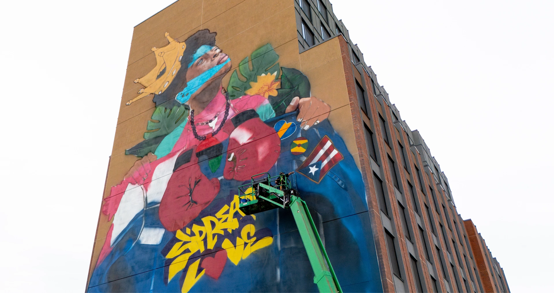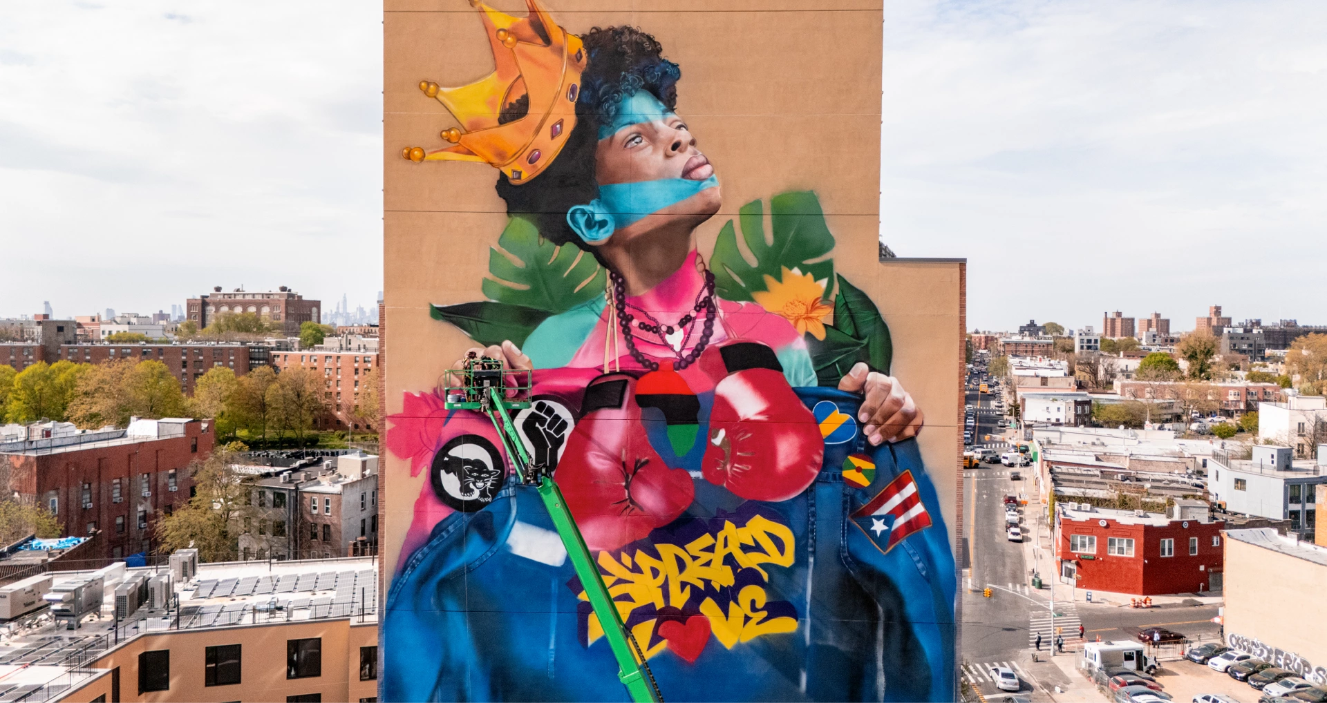 “Brownsville King of Love” is the largest ever mural in Brookly, rising 145 feet tall and 40 feet wide on the side of a new affordable housing building. This project was made possible through partnership with Slate Property Group and RiseBoro Community Partnership, with input from local stakeholders — including youth at the Browsnville Community Justice Center — to ensure it reflects the voices of the people who call Brownsville home.
