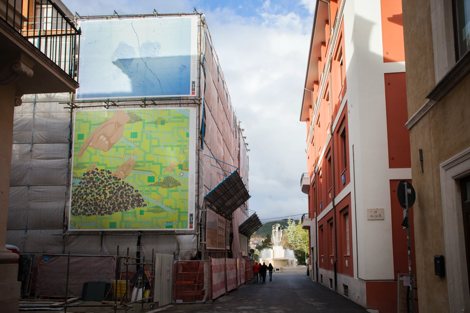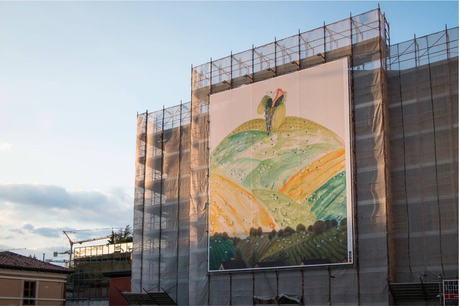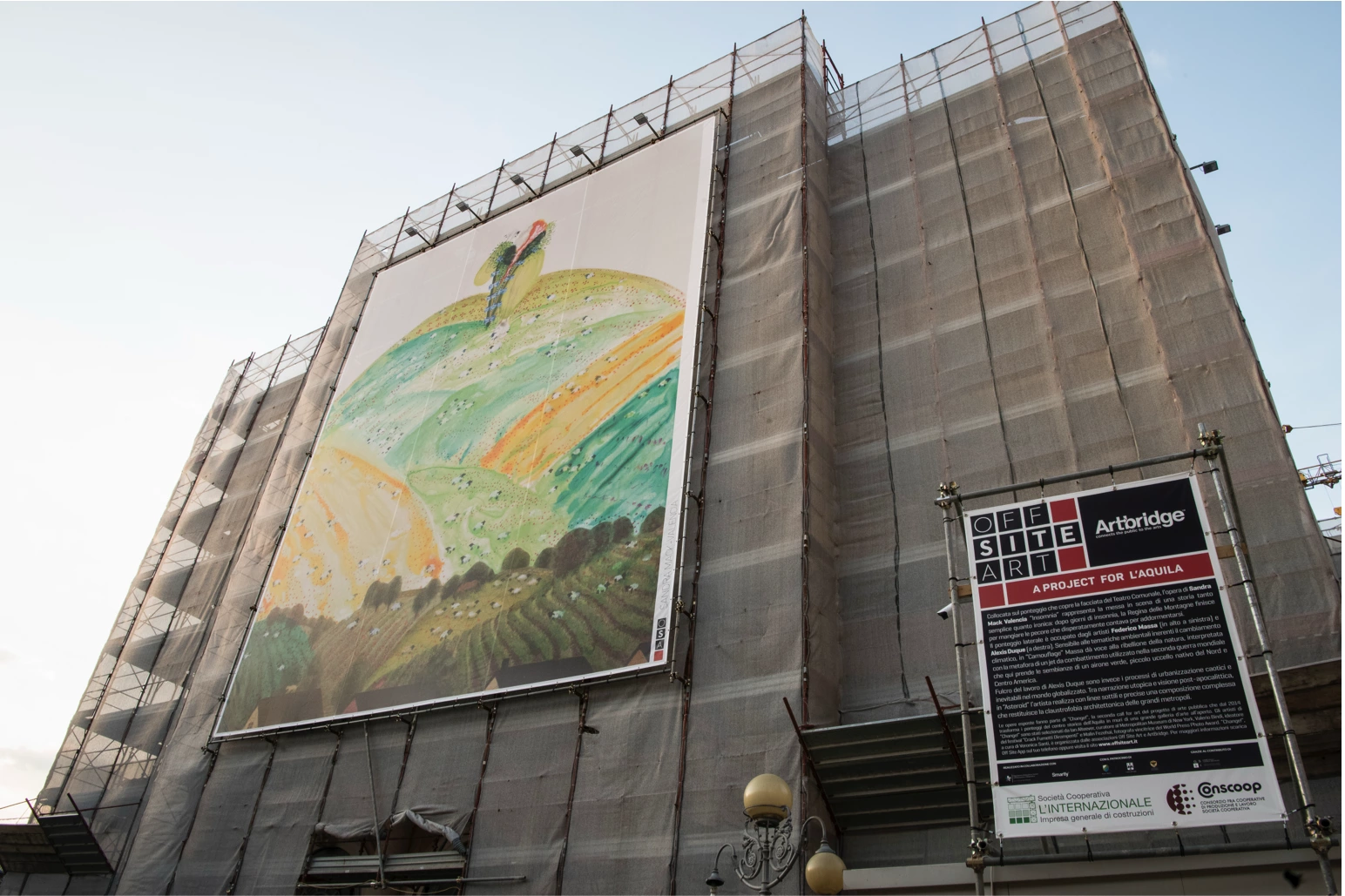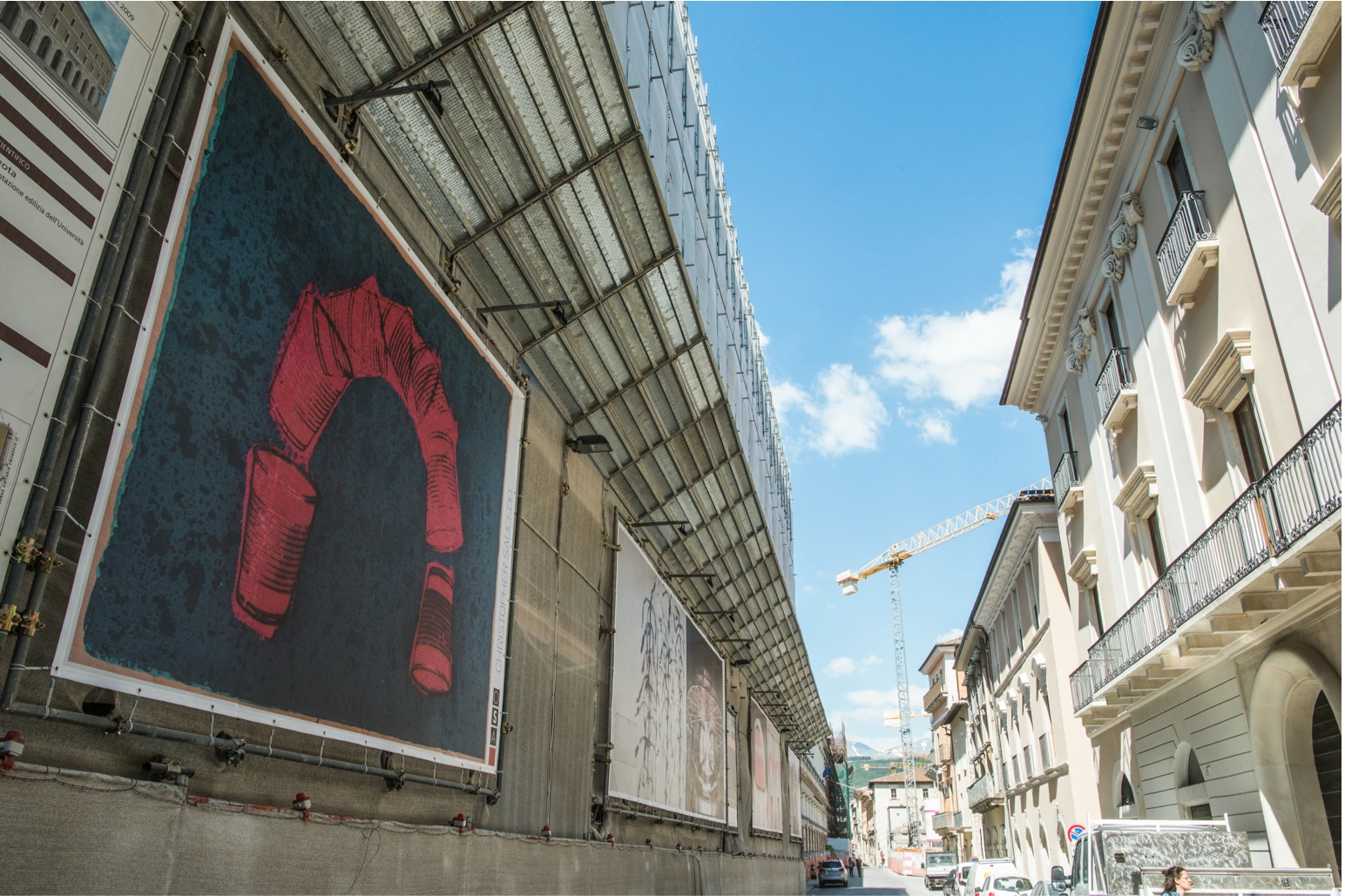 In collaboration with the American non-profit organization ArtBridge, the L’Aquila association had opened a call for artists residing in Italy and in New York City, which resulted in 350 submissions for a total of 1400 works. Throughout 2017, the winners’ works were printed on vinyl and installed on the scaffolding of the buildings under reconstruction, accompanying the rebirth of L’Aquila. Change! was made possible thanks to the contribution of the Gran Sasso Science Institute.