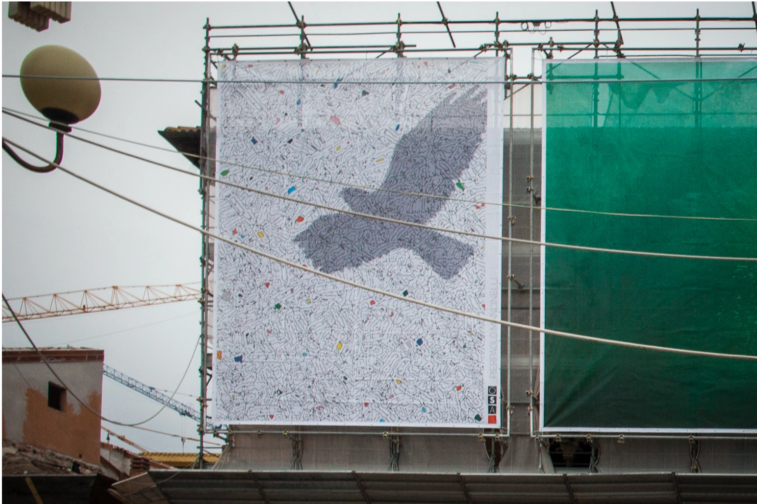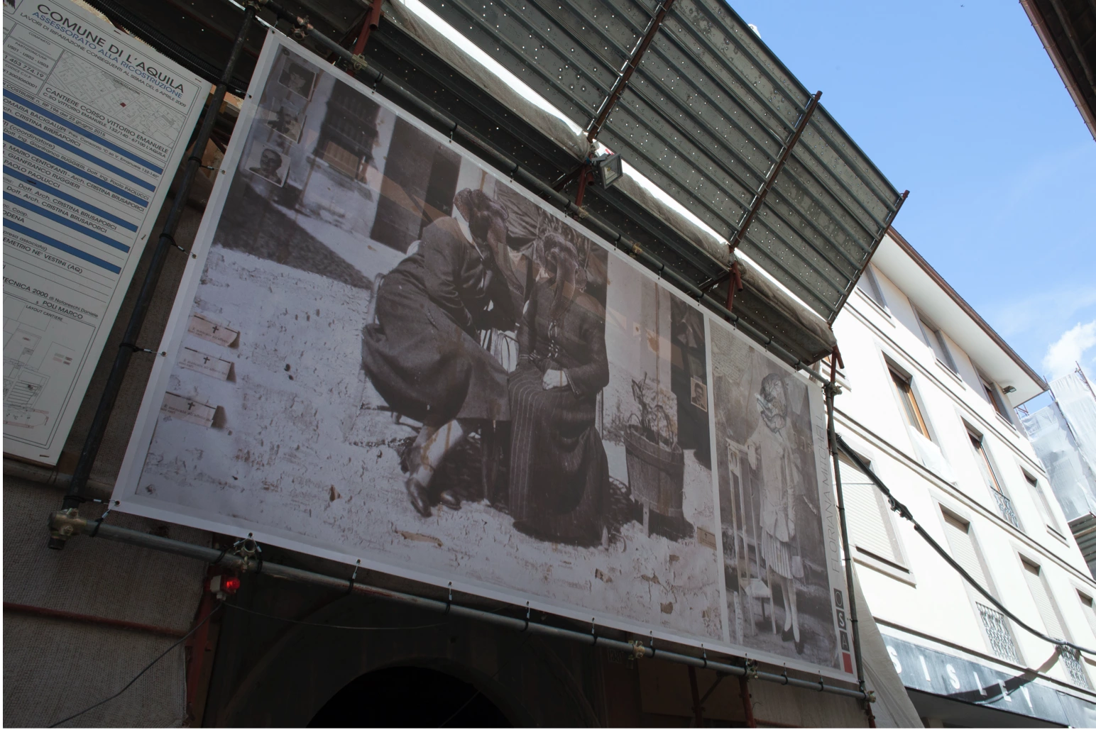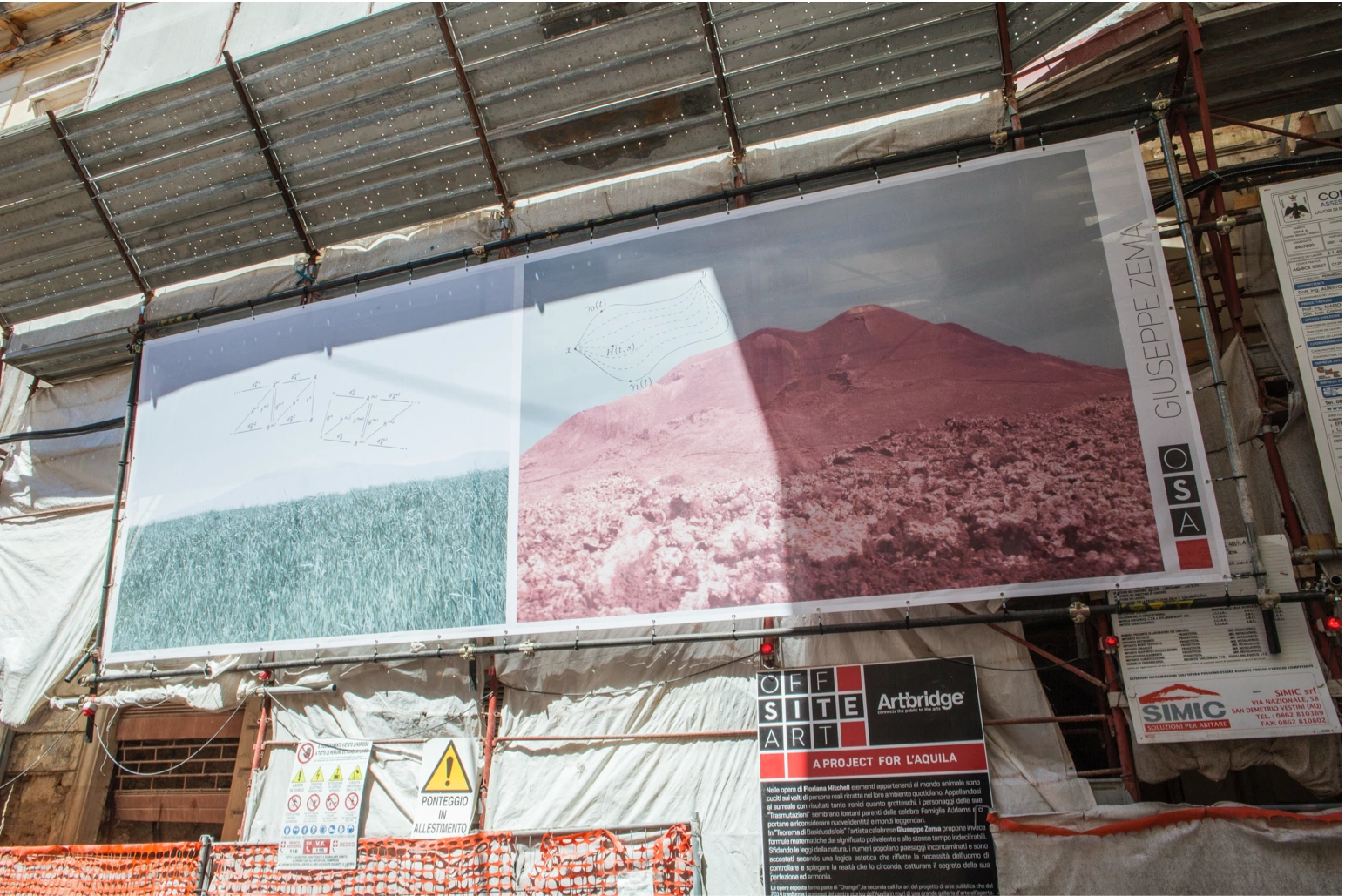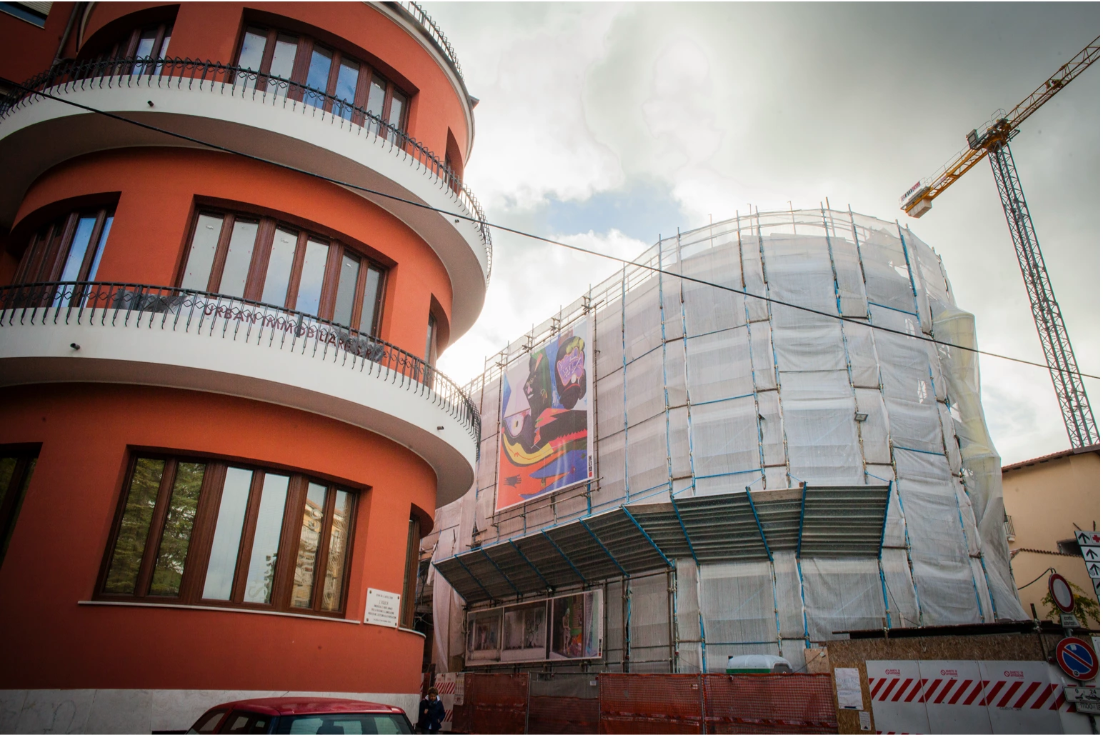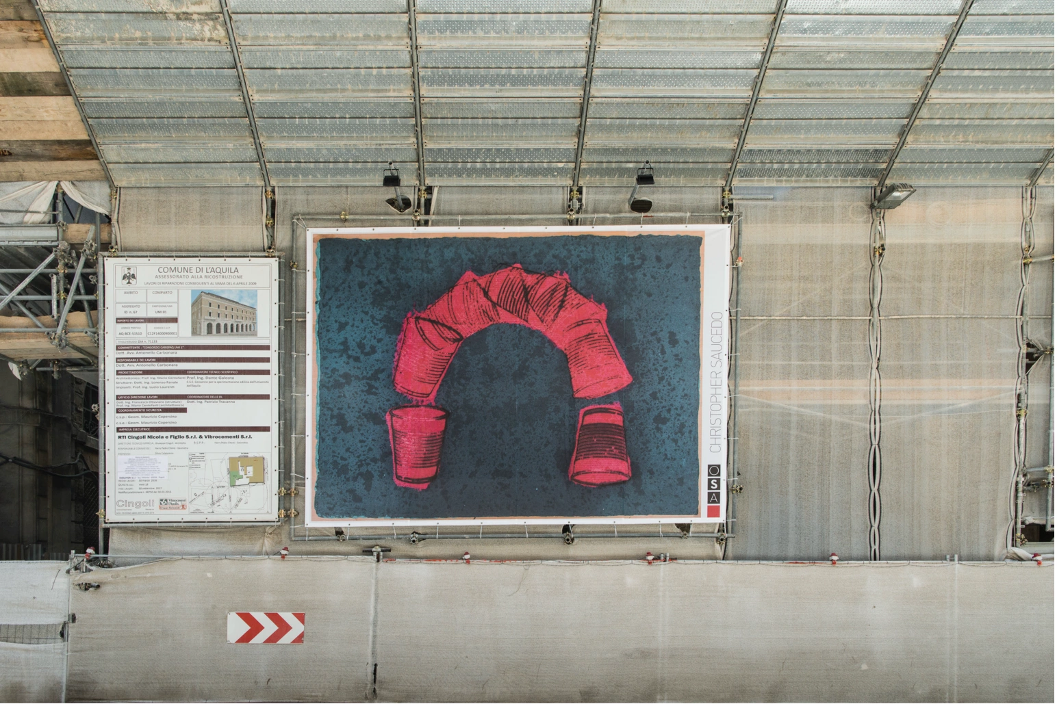 In collaboration with the American non-profit organization ArtBridge, the L’Aquila association had opened a call for artists residing in Italy and in New York City, which resulted in 350 submissions for a total of 1400 works. Throughout 2017, the winners’ works were printed on vinyl and installed on the scaffolding of the buildings under reconstruction, accompanying the rebirth of L’Aquila. Change! was made possible thanks to the contribution of the Gran Sasso Science Institute.