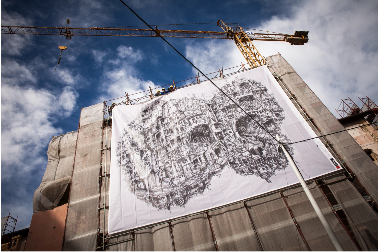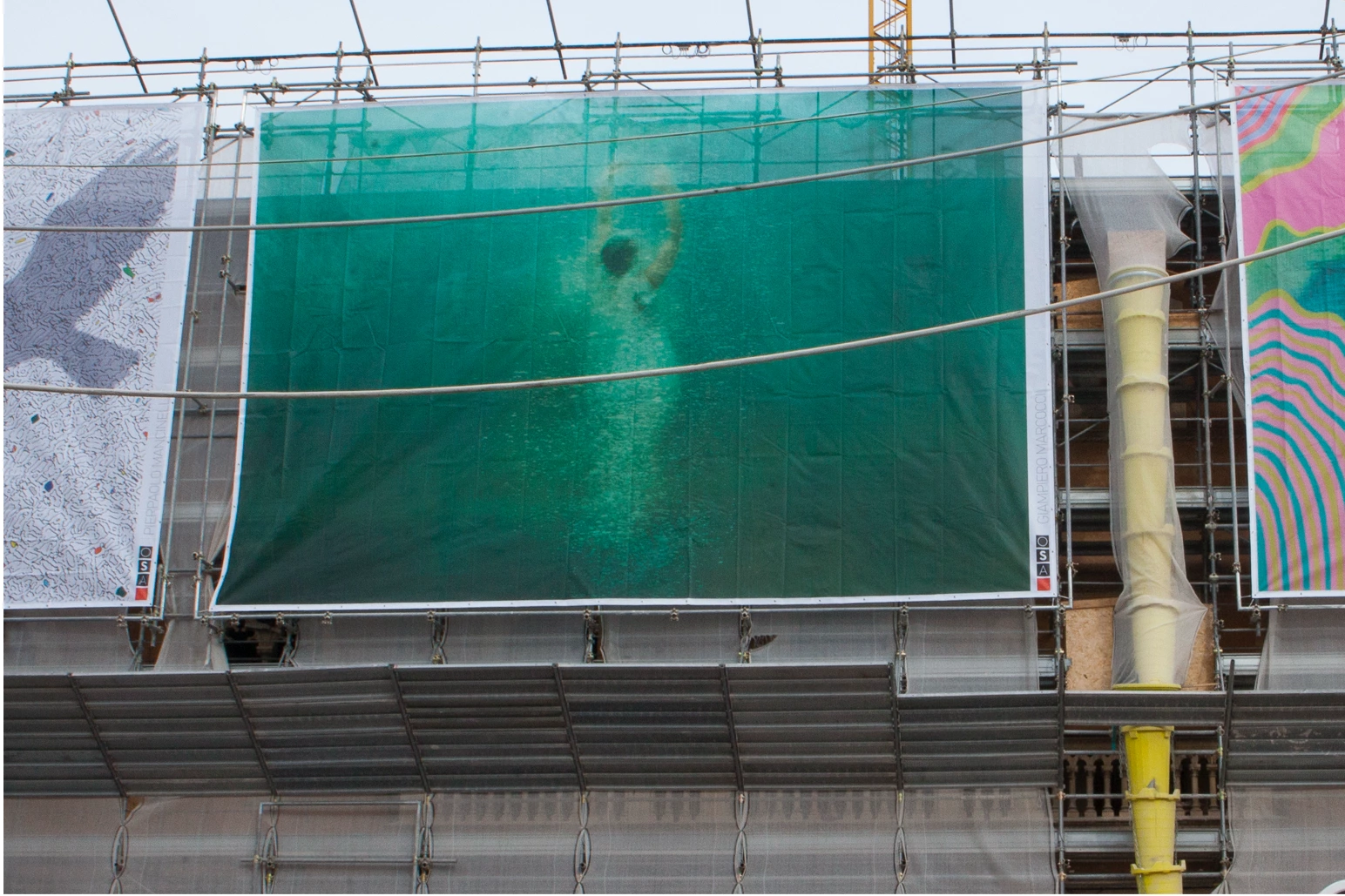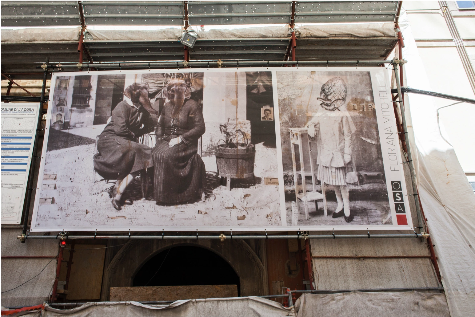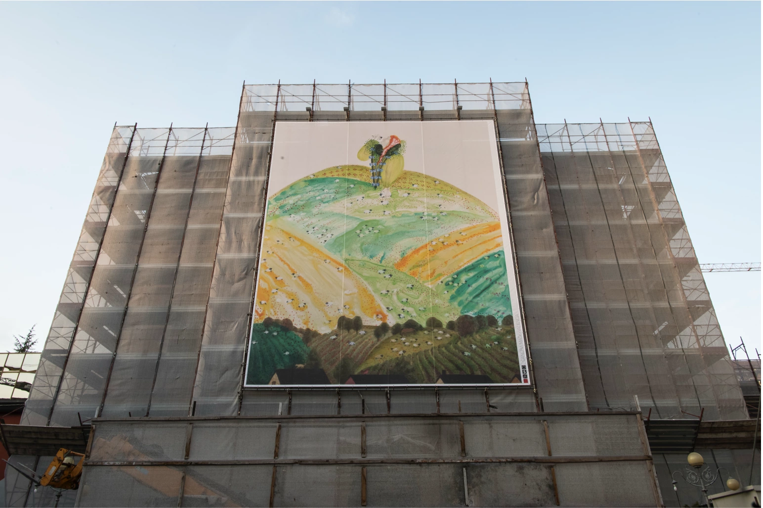 In collaboration with the American non-profit organization ArtBridge, the L’Aquila association had opened a call for artists residing in Italy and in New York City, which resulted in 350 submissions for a total of 1400 works. Throughout 2017, the winners’ works were printed on vinyl and installed on the scaffolding of the buildings under reconstruction, accompanying the rebirth of L’Aquila. Change! was made possible thanks to the contribution of the Gran Sasso Science Institute.