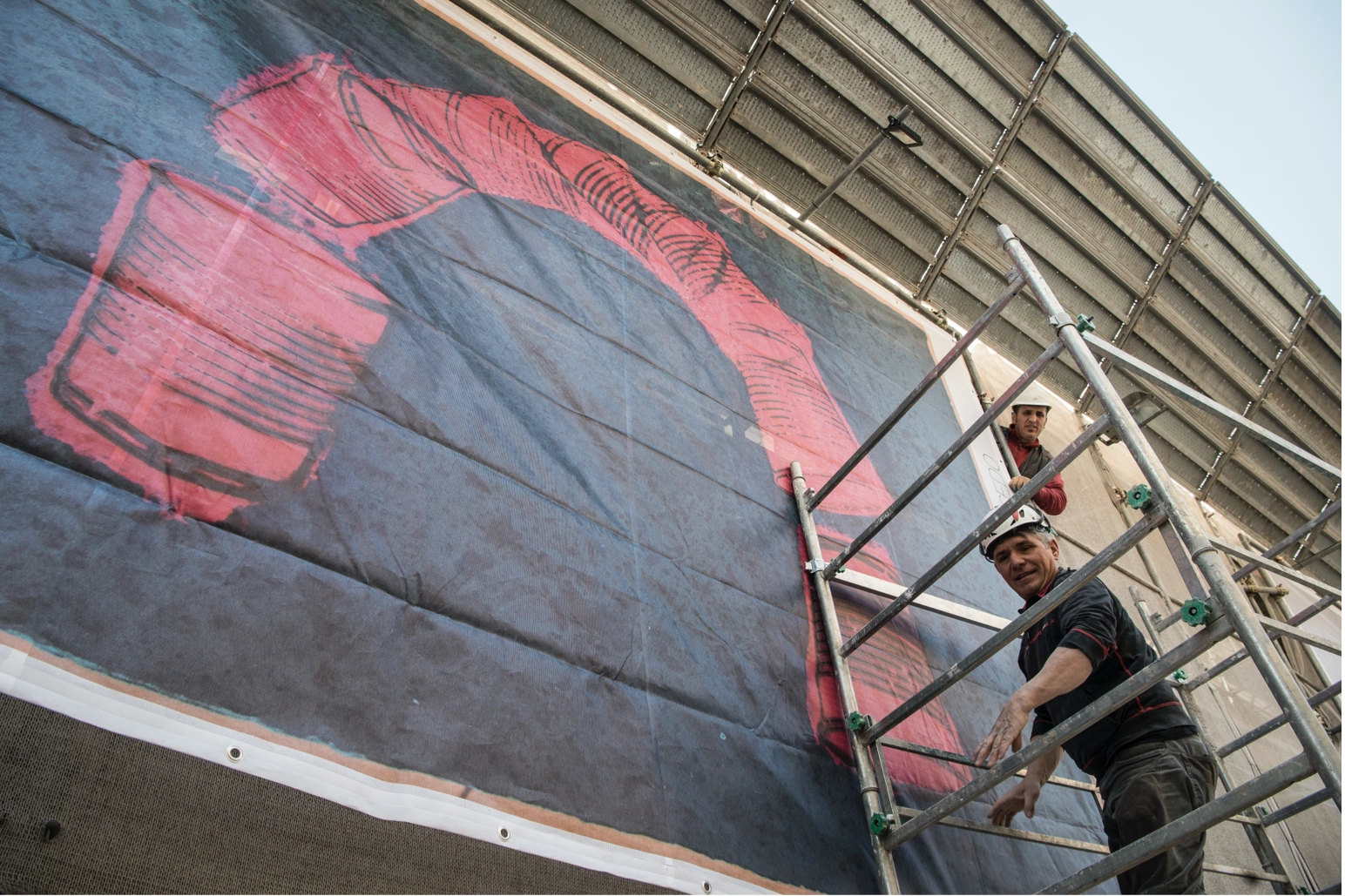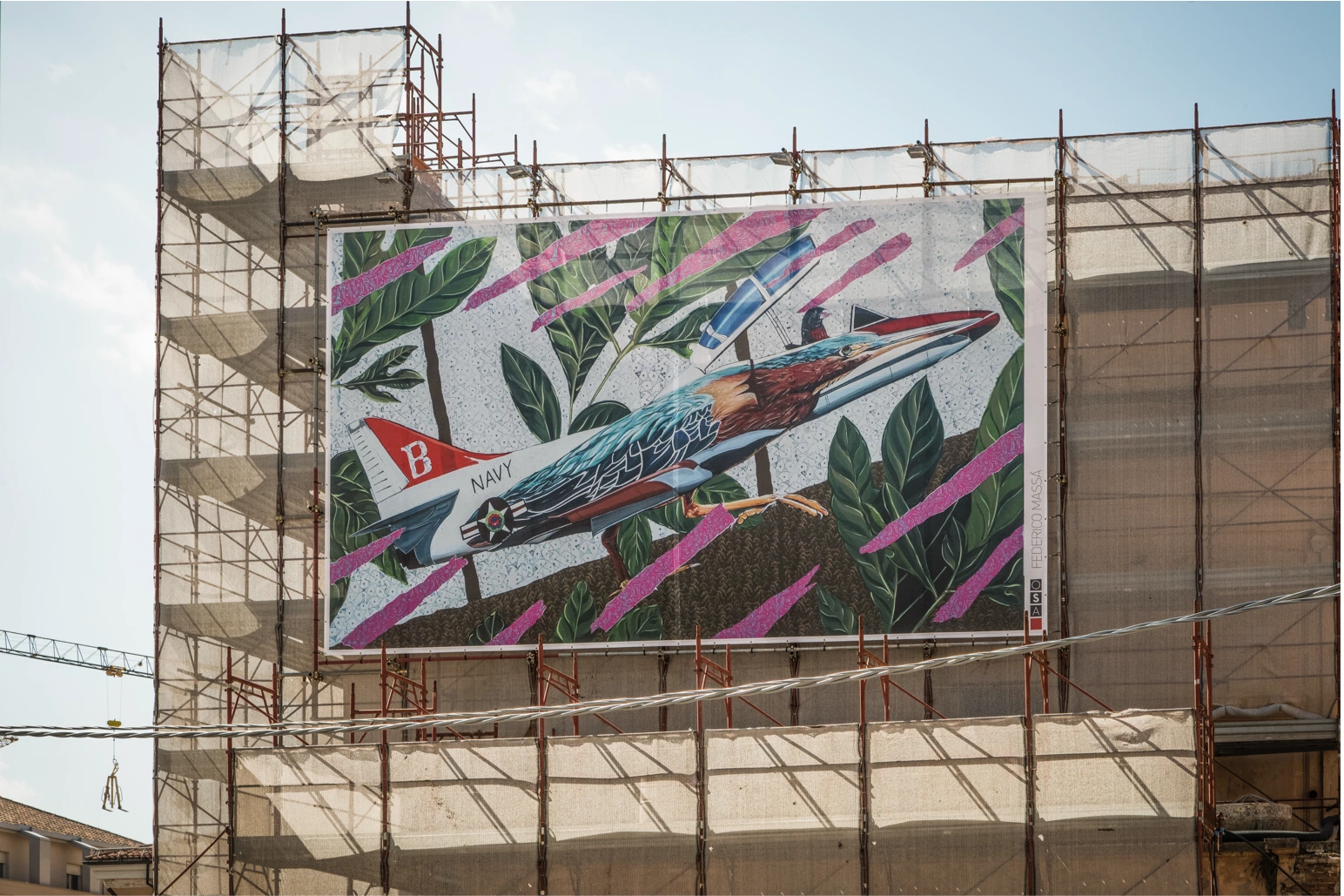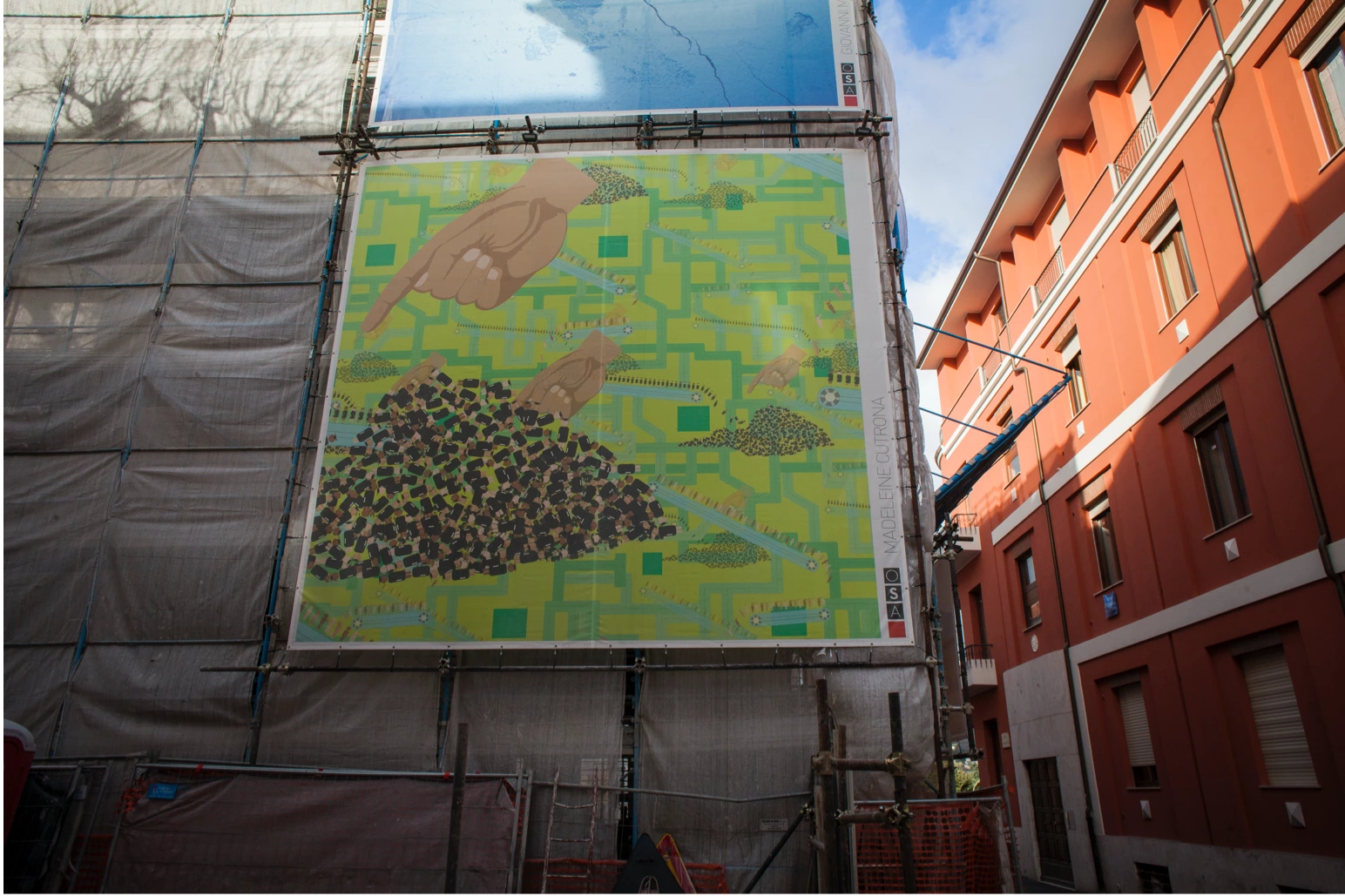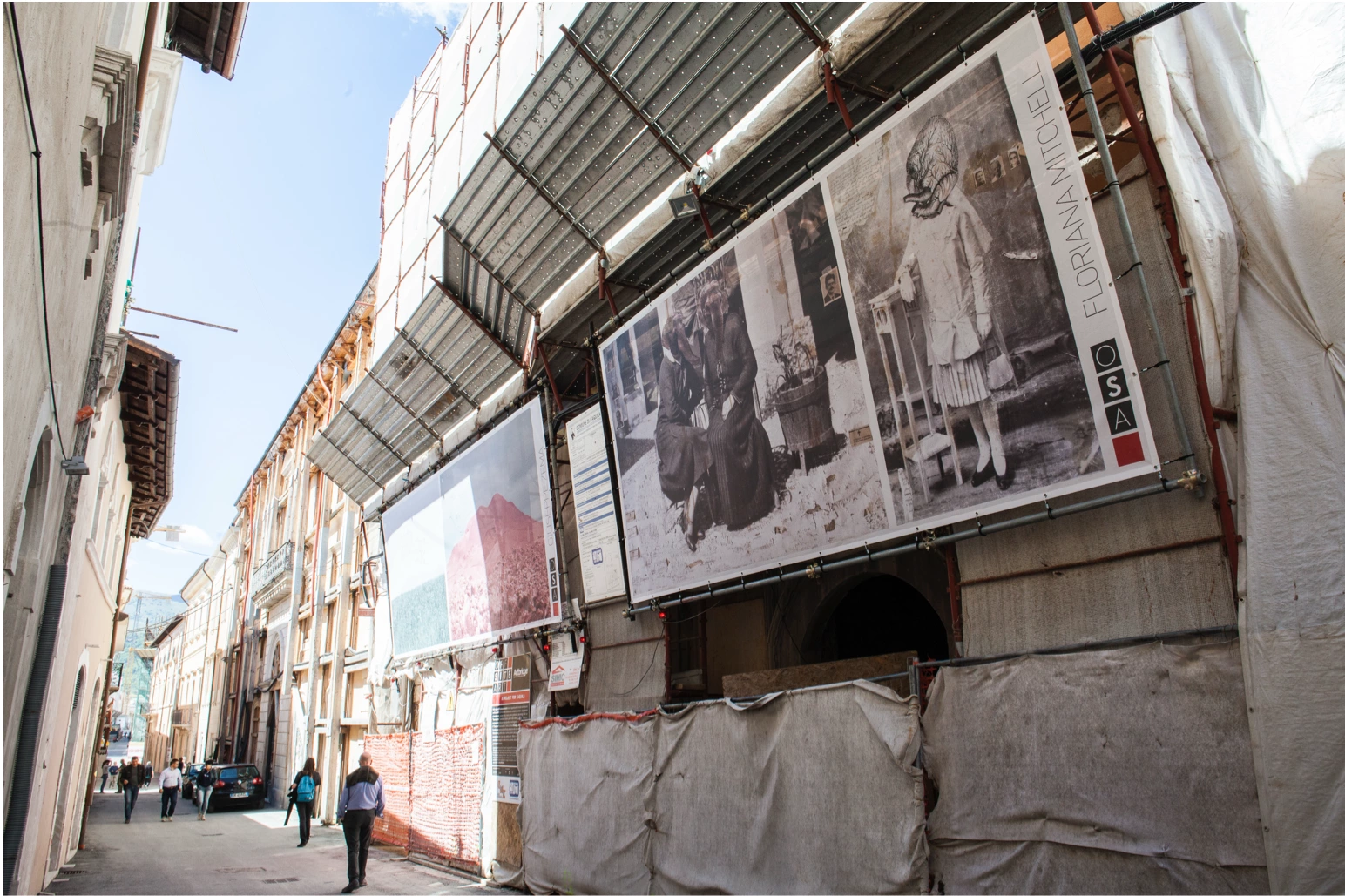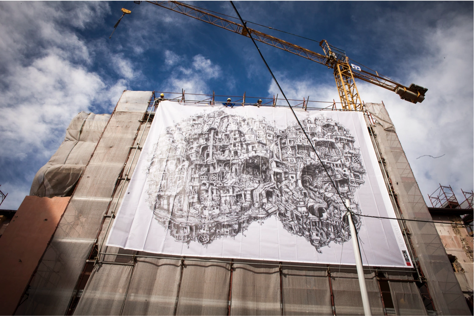In collaboration with the American non-profit organization ArtBridge, the L’Aquila association had opened a call for artists residing in Italy and in New York City, which resulted in 350 submissions for a total of 1400 works. Throughout 2017, the winners’ works were printed on vinyl and installed on the scaffolding of the buildings under reconstruction, accompanying the rebirth of L’Aquila. Change! was made possible thanks to the contribution of the Gran Sasso Science Institute.