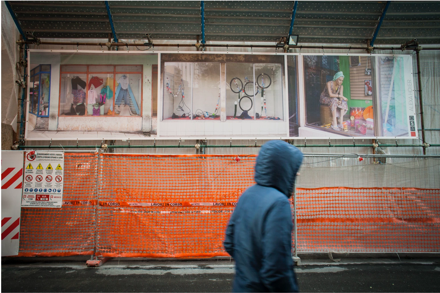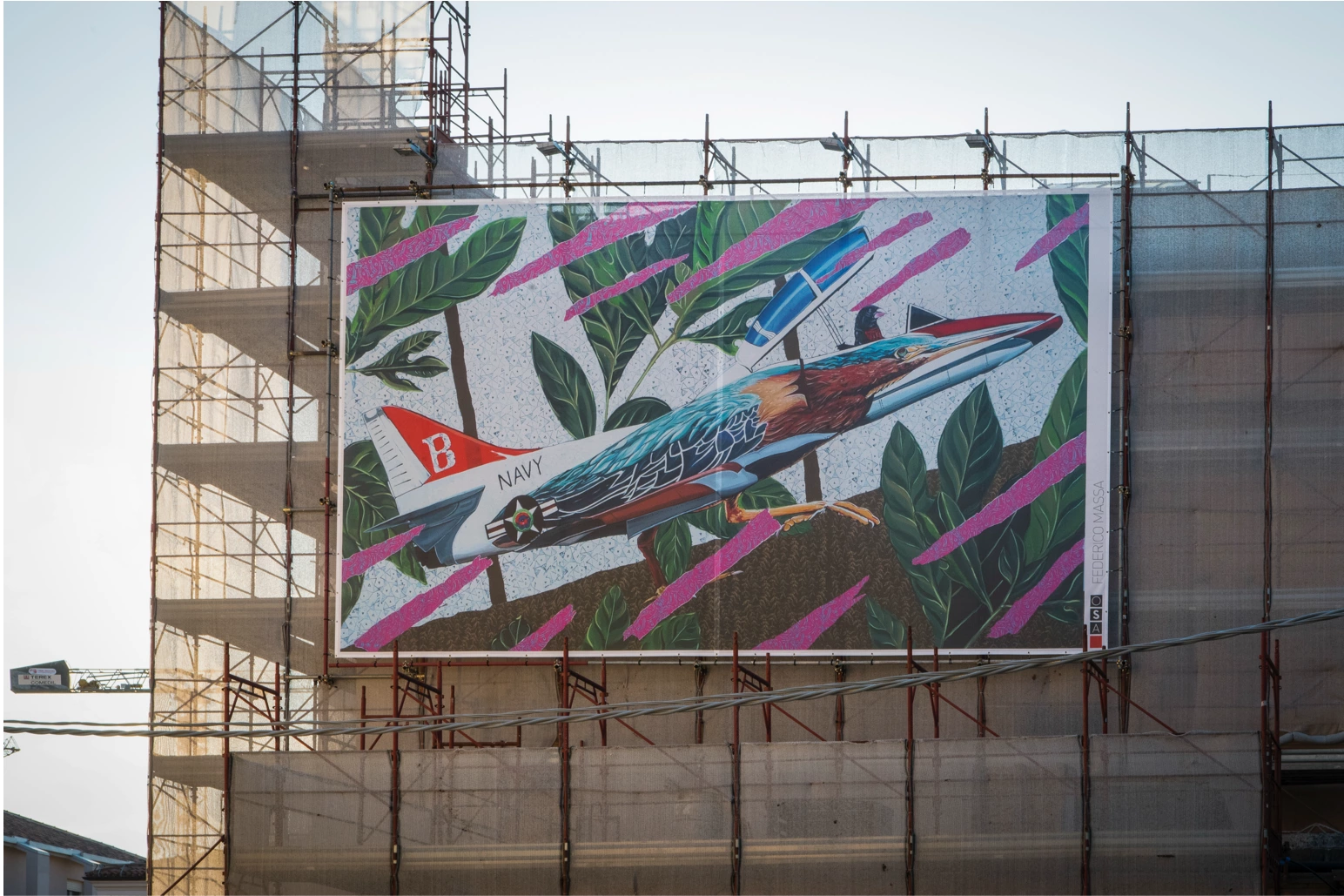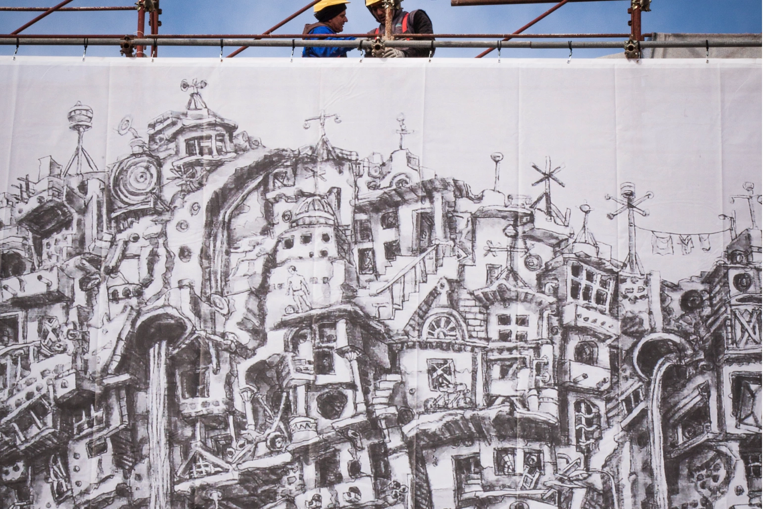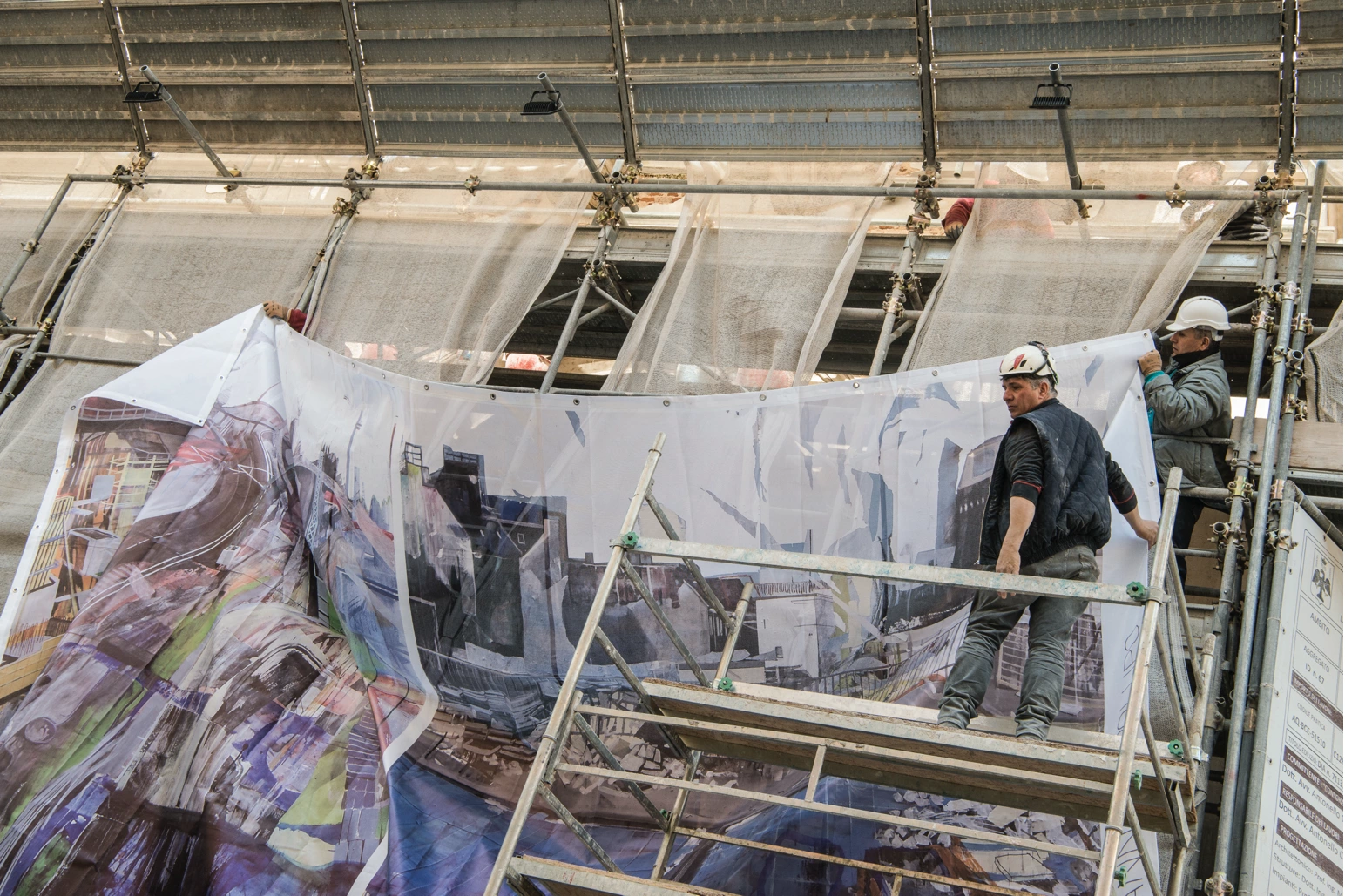 In collaboration with the American non-profit organization ArtBridge, the L’Aquila association had opened a call for artists residing in Italy and in New York City, which resulted in 350 submissions for a total of 1400 works. Throughout 2017, the winners’ works were printed on vinyl and installed on the scaffolding of the buildings under reconstruction, accompanying the rebirth of L’Aquila. Change! was made possible thanks to the contribution of the Gran Sasso Science Institute.