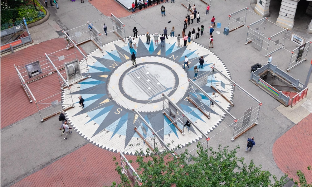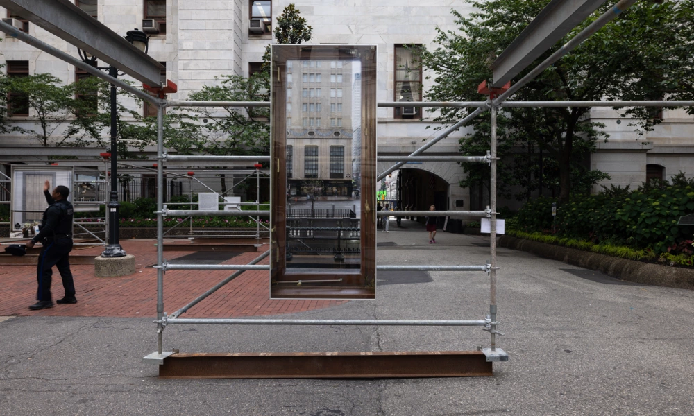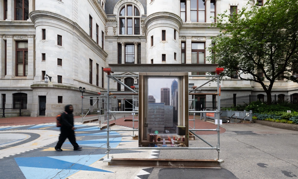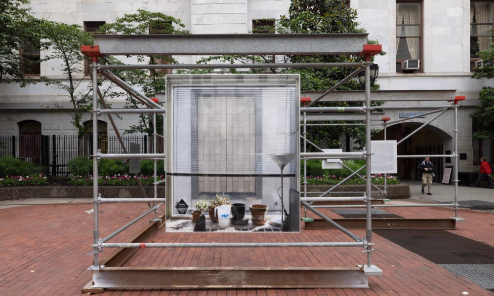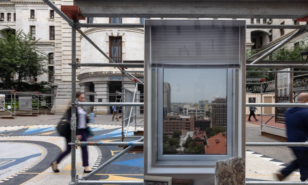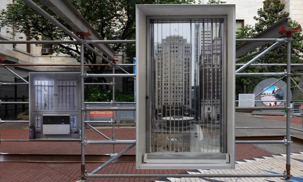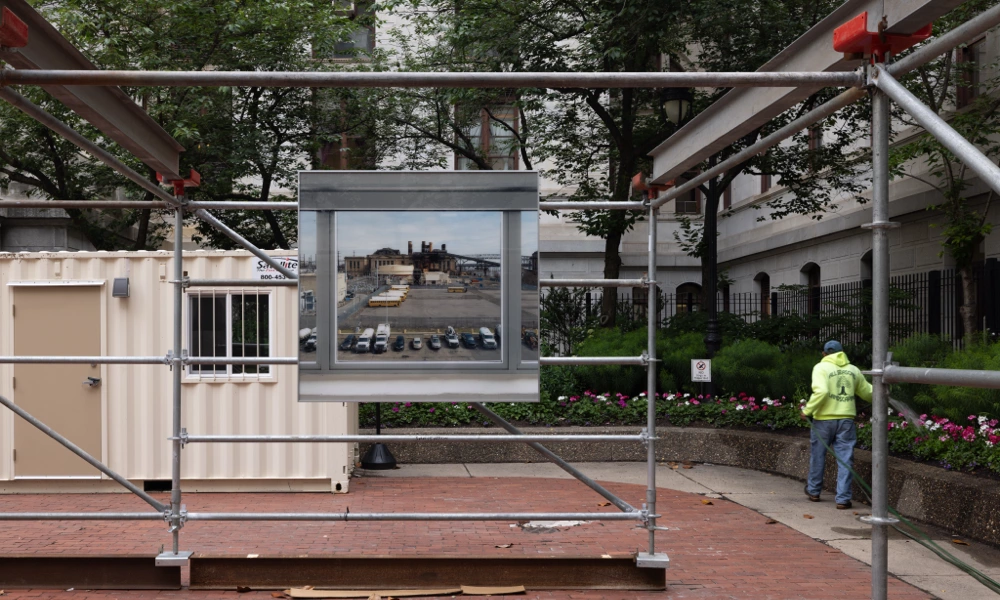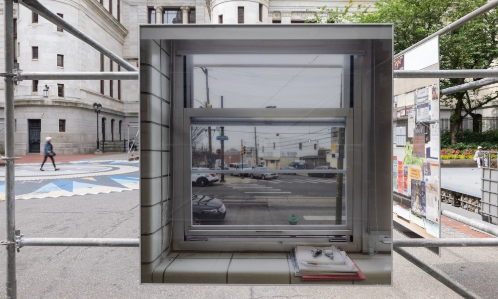 The exhibit was installed in front of Philadelphia City Hall Courtyard from May 23 to June 11, 2025. The installation combined large-scale photography with interview excerpts over the course of two years, with the goal of humanizing city government workers. Martínez Poppe photographed office windows from over twenty municipal agencies, conducted more than thirty staff interviews, and captured over forty window views. The photographs were reproduced at 1-to-1 scale and hung to exact specifications, replicating the experience of looking out from each employee’s office and opening these hidden workspaces to public view.