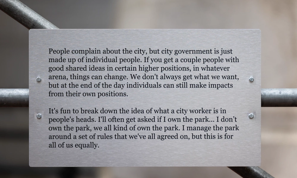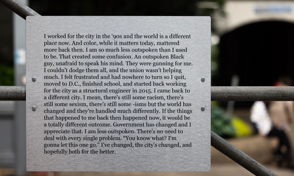 Anonymous interview excerpts on text panels accompanied the photographs, revealing the pride, complexity, and contradictions of public sector work. The quotes explored how employees came to work for city government, their reflections on their duties, how their careers were perceived, and their hopes for Philadelphia.