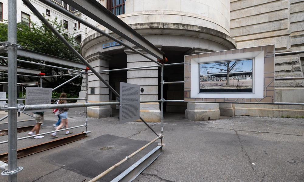 The photographs and text were mounted on scaffolding arranged to create an abstracted map of Philadelphia, helping visitors locate these municipal buildings across the city. The scaffolding symbolized both evolving public attitudes toward government and the changing urban landscape.